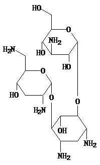 本品主要成份为:妥布霉素。其化学名称为:O-3-氨基-3-脱氧- a -O-葡吡喃糖基-(1→6)-O-[2,6-二氨基-2, 3, 6-三脱氧-a -D-核-己吡喃糖基-(1→4)]-2-脱氧-D-链霉胺。