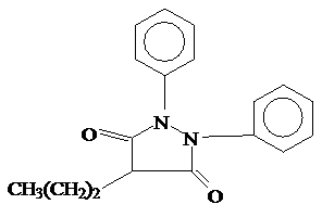 本品主要成份为:保泰松。其化学名称为:1,2-二苯基-4-正丁基吡唑烷-3,5-二酮。